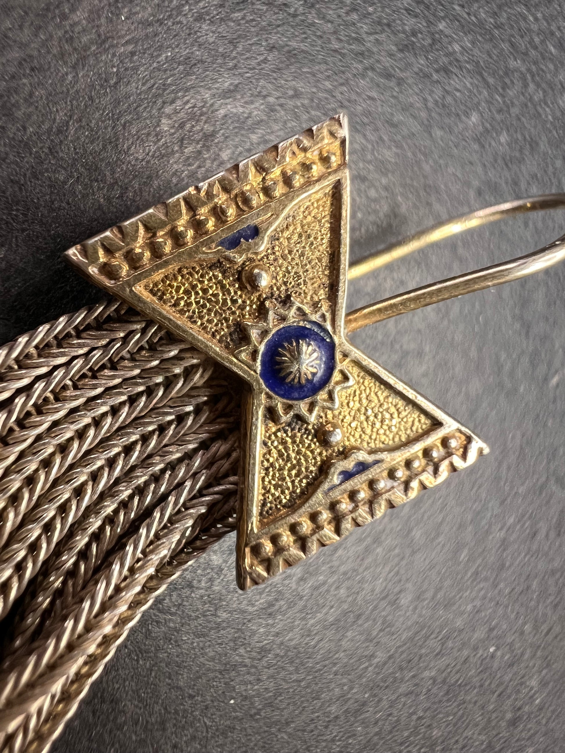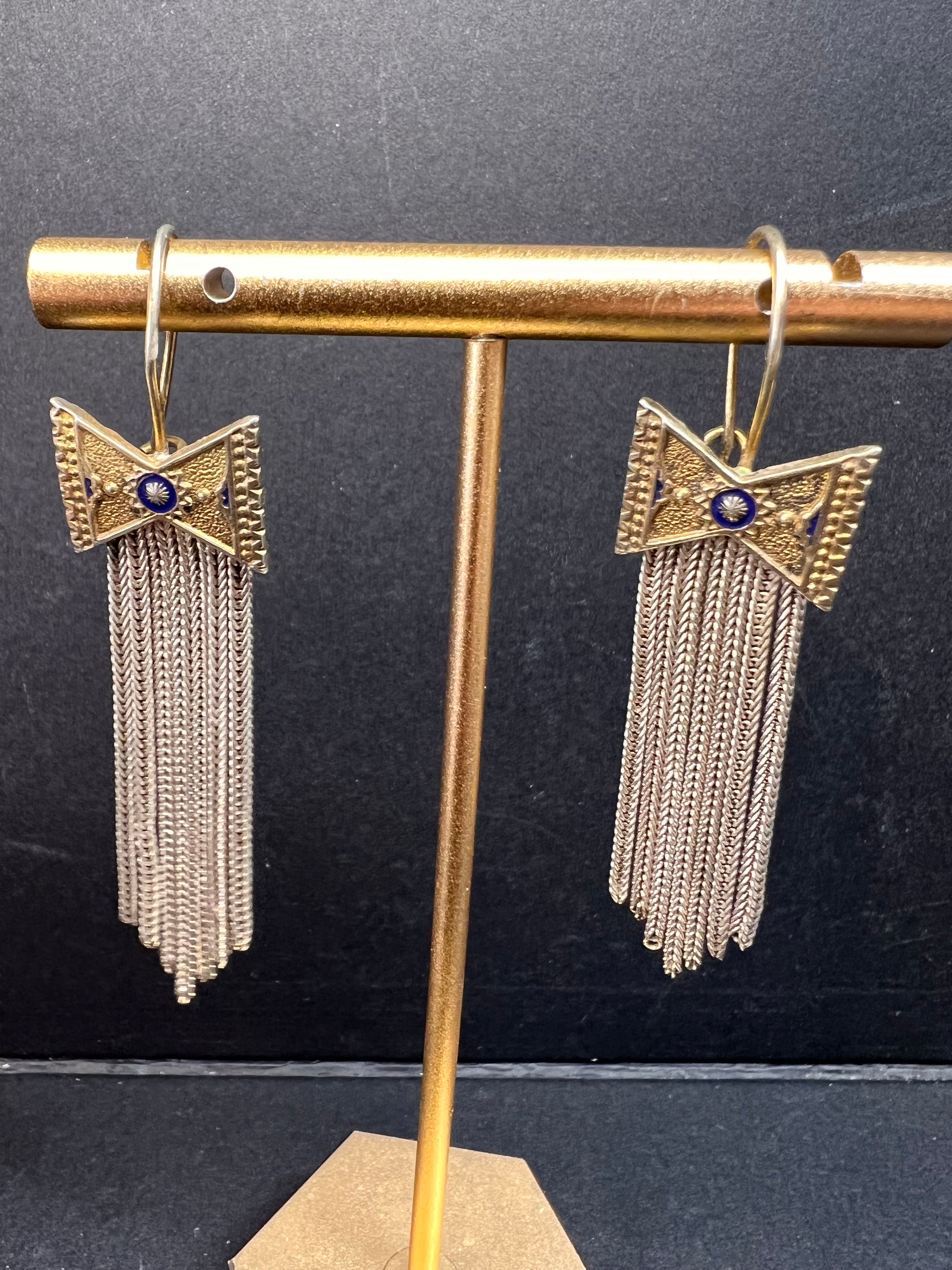 Vintage fringe earring in two toned silver and gold over 925 sterling silver with fish hook ear wires. Earrings measure a little over 2 inches in length and weigh 6.65 grams. Blue star enamel design in the center of a unique bow shape. I believe these might actually be antique 1920s Edwardian era.