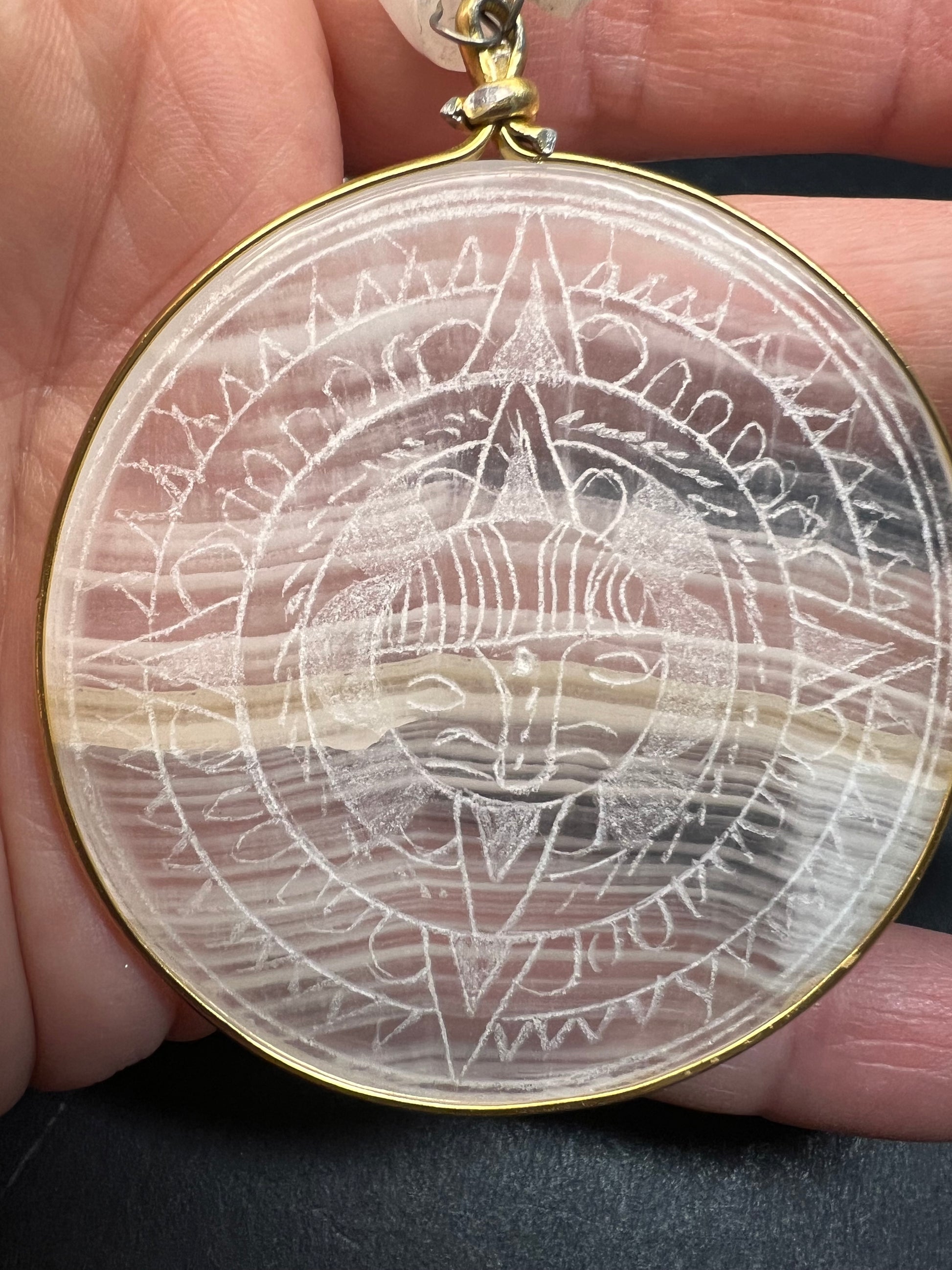 Vintage white onyx Aztec sundial 24 inch pendant necklace