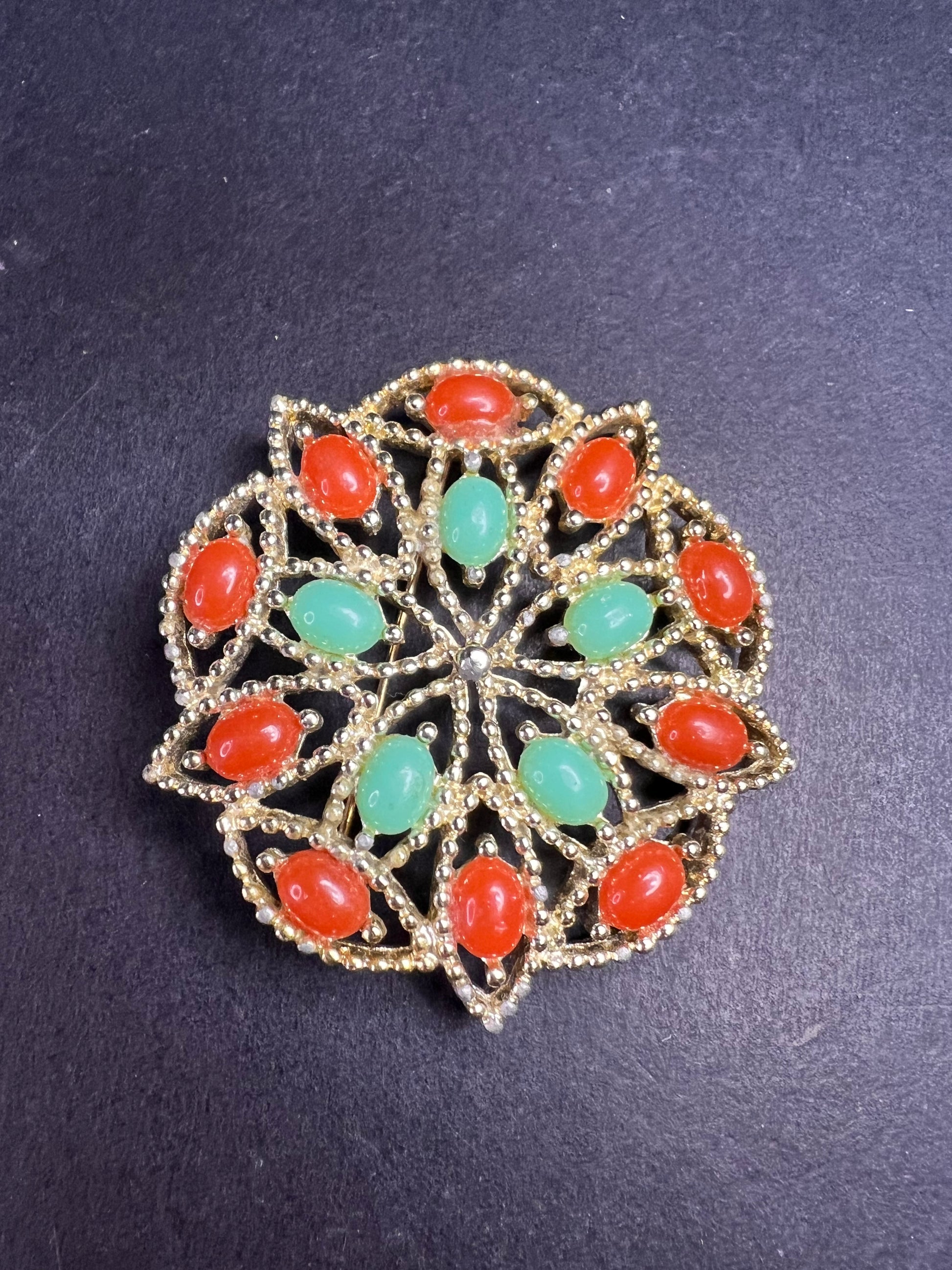 VTG Sarah Coventry Acapulco Red Green Sim Turquoise & Coral Brooch Pin