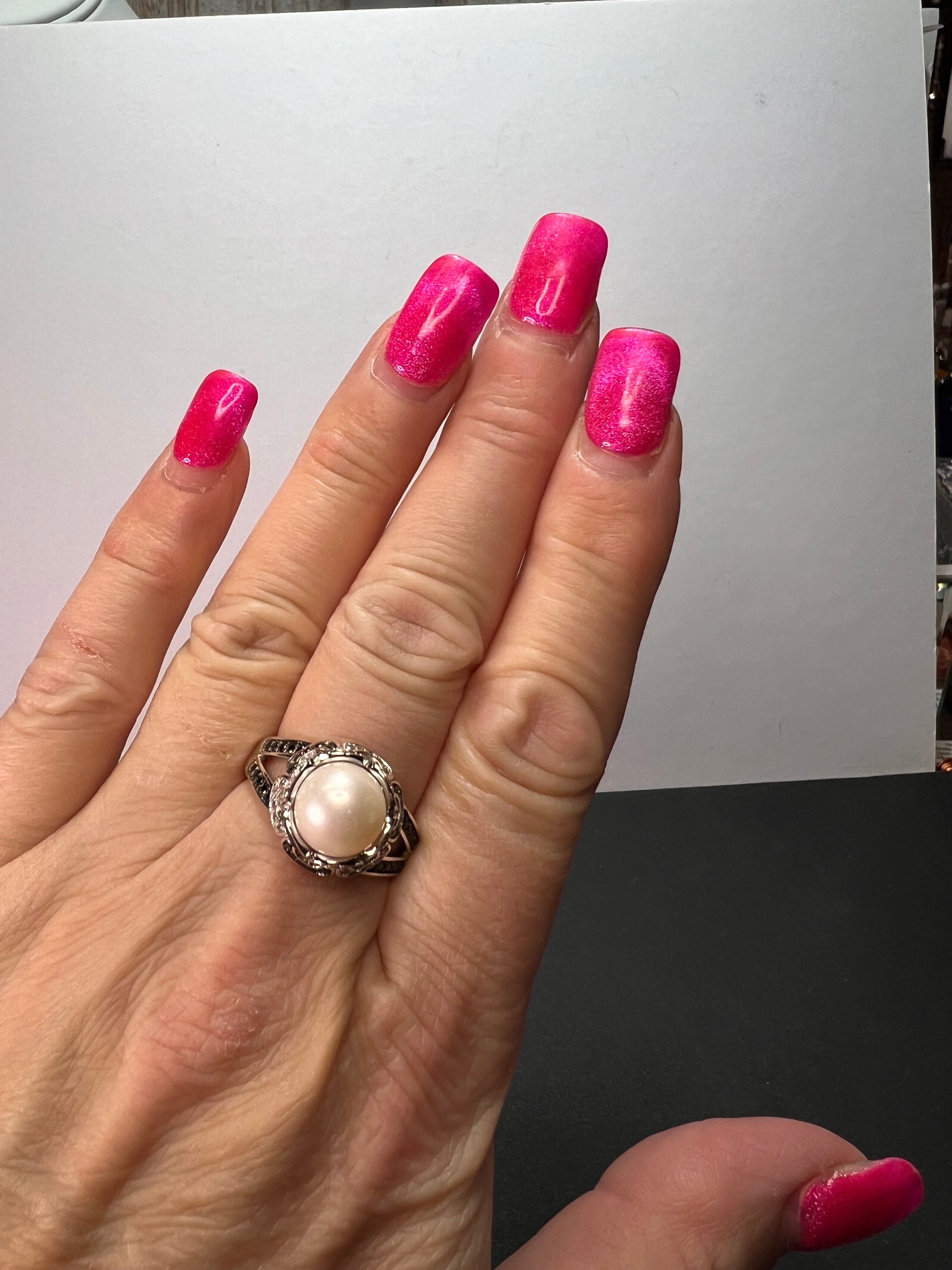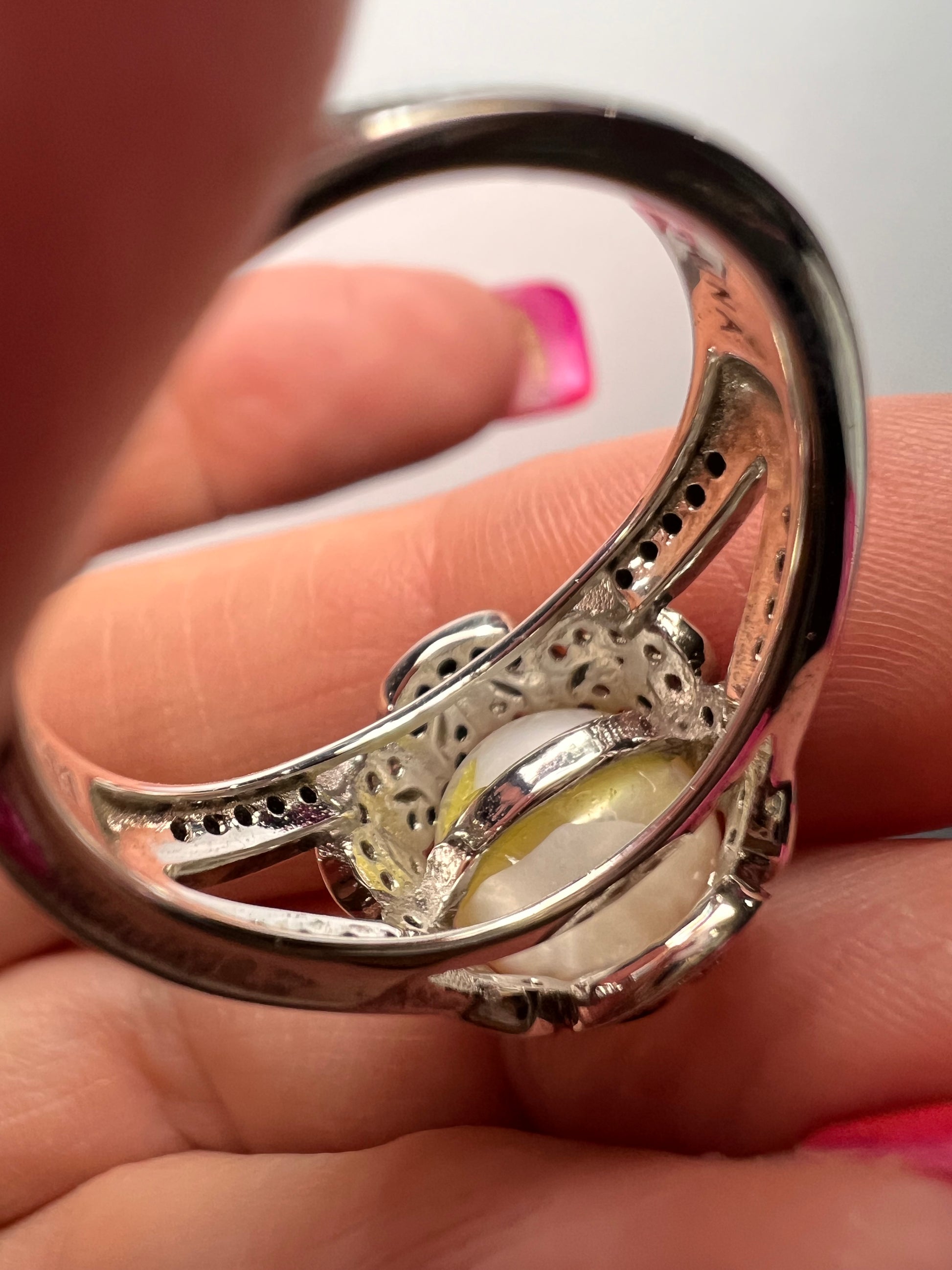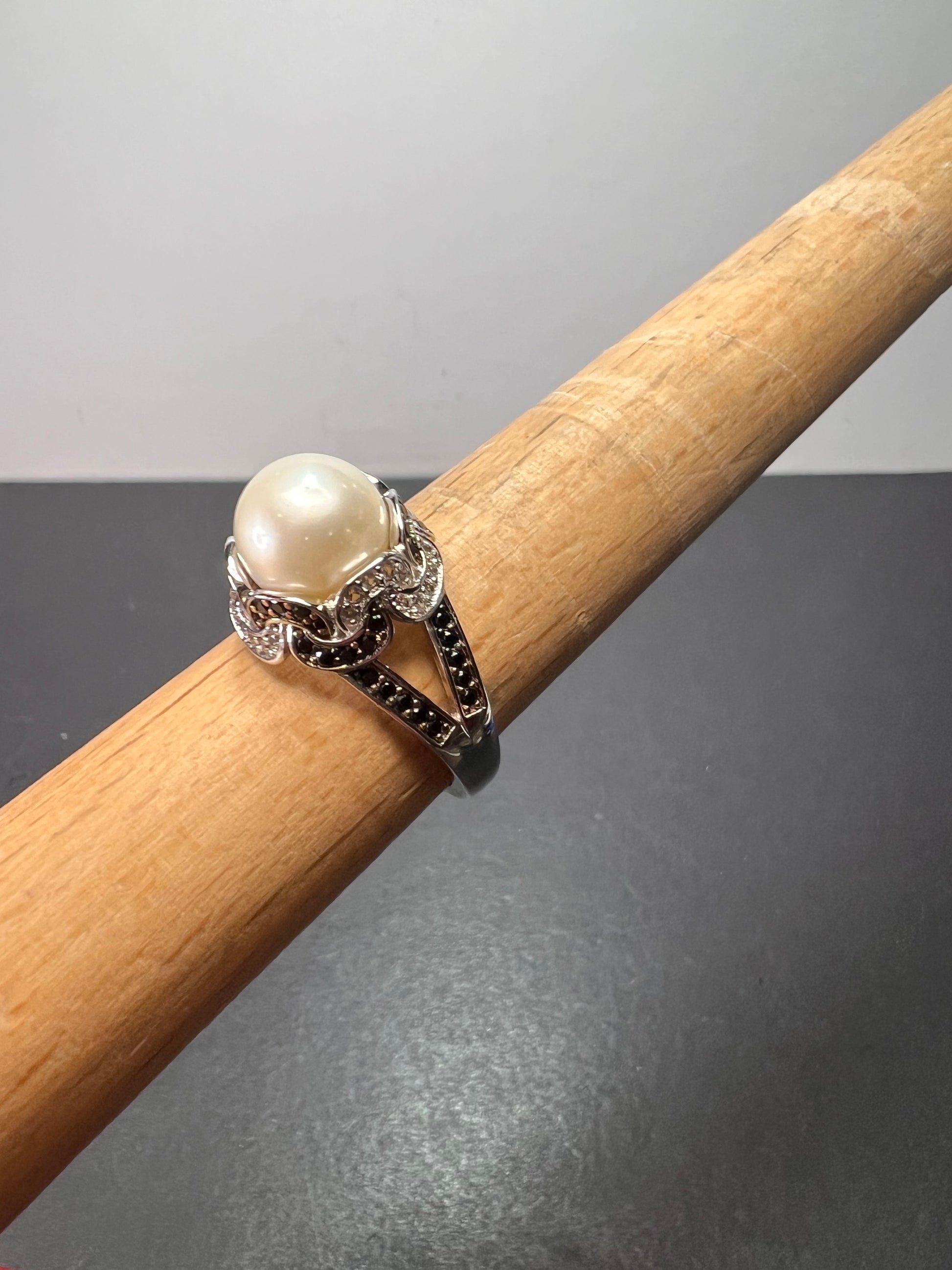 Genuine white cultured pearl set in platinum plated over sterling silver. Small white accent stones test as zircon. Small black accent stones test as spinel. Size 9. BBJ 925