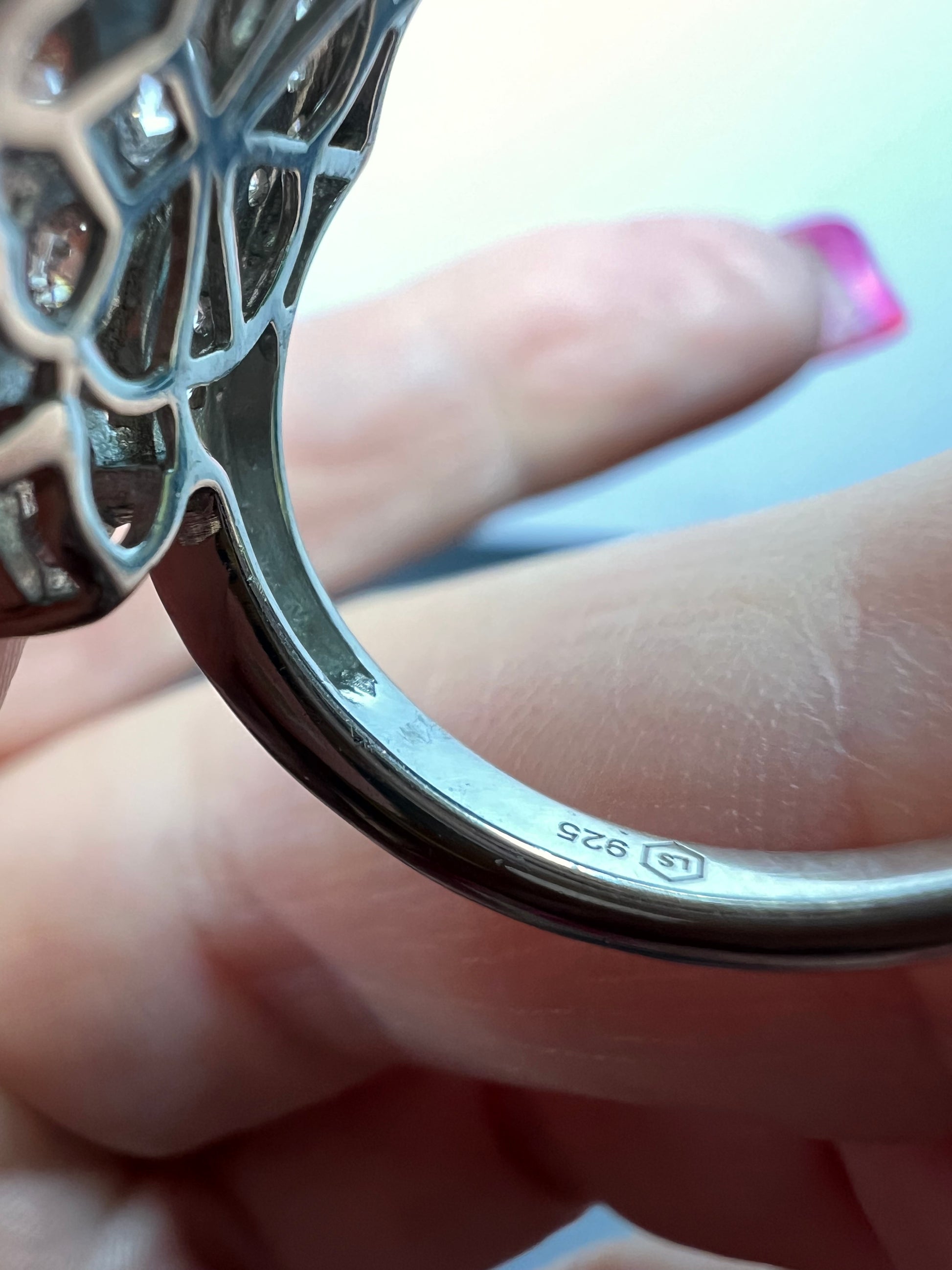 White cubic zirconia round and marquise stones prong set in rhodium plated over sterling silver. Size 9. 925